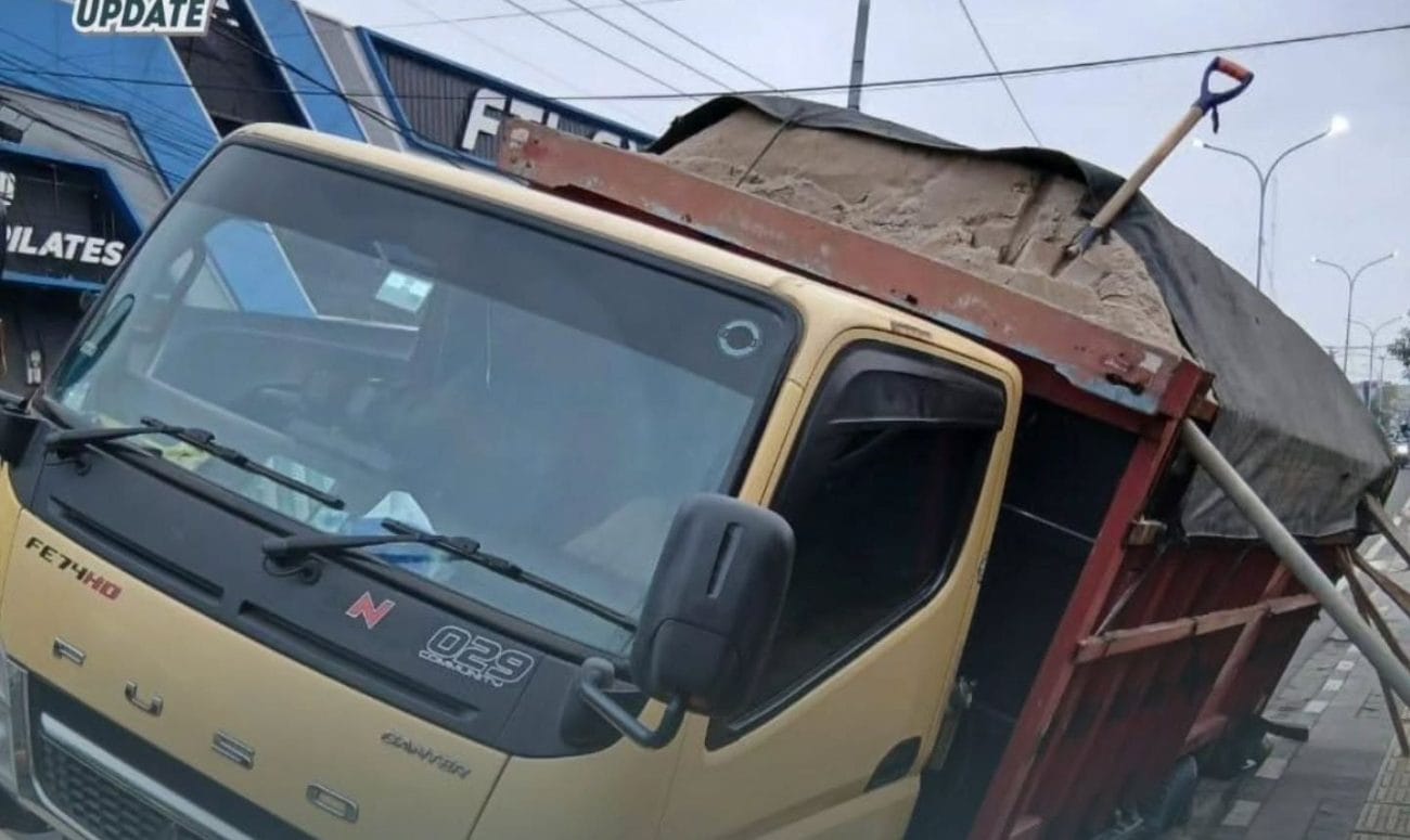 Sebuah truk bermuatan pasir terperosok ke lubang galian di Jalan Kartini, Depok, Jawa Barat, pada Rabu (15/10/2025) pagi...