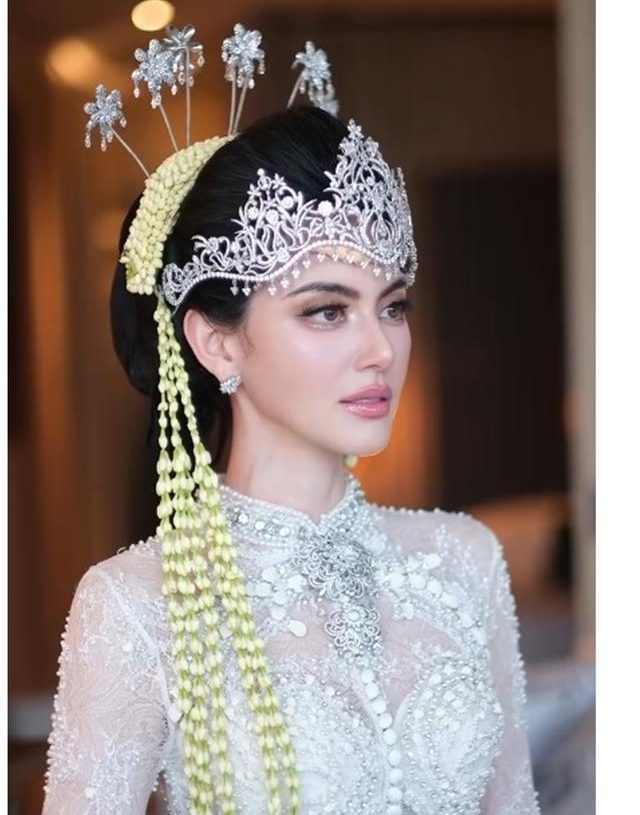Mahkota Siger Sunda menjadi elemen kunci dalam tampilan tersebut. Siger ini dipasangkan dengan sanggul rapi dan aksesori tradisional seperti kembang goyang dan untaian bunga melati di sisi rambut, serta sembilan hiasan “bintang” di bagian belakang sanggul — semua tampak menyatu secara harmonis.