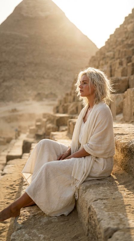 Matahari berada tepat di belakang Piramida Khafre yang menjulang di hadapannya. Cahaya golden hour itu tidak sopan; ia menghantam dengan kekuatan penuh, menciptakan siluet raksasa dari struktur batu purba itu, mengubah puncaknya yang masih berselimut batu kapur Tura asli menjadi mahkota api. Bagi Anya, cahaya itu adalah sebuah backlight alami yang kejam namun indah. Ia tahu rambut pirang platinumnya yang panjang, yang kini berkibar liar ditiup angin gurun yang panas dan berdebu, pasti menyala seperti halo di sekitar kepalanya.