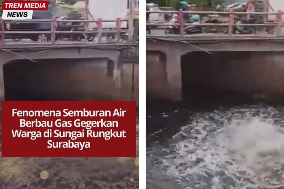 Fenomena semburan air berbau gas di aliran Sungai Rungkut, tepatnya di kawasan Kebon Agung, Rungkut Tengah, Kecamatan Gunung Anyar, Surabaya, sejak Kamis (16/10/2025) hingga siang ini, menghebohkan warga sekitar. Banyak warga yang berdatangan untuk menyaksikan langsung semburan yang tak biasa tersebut.