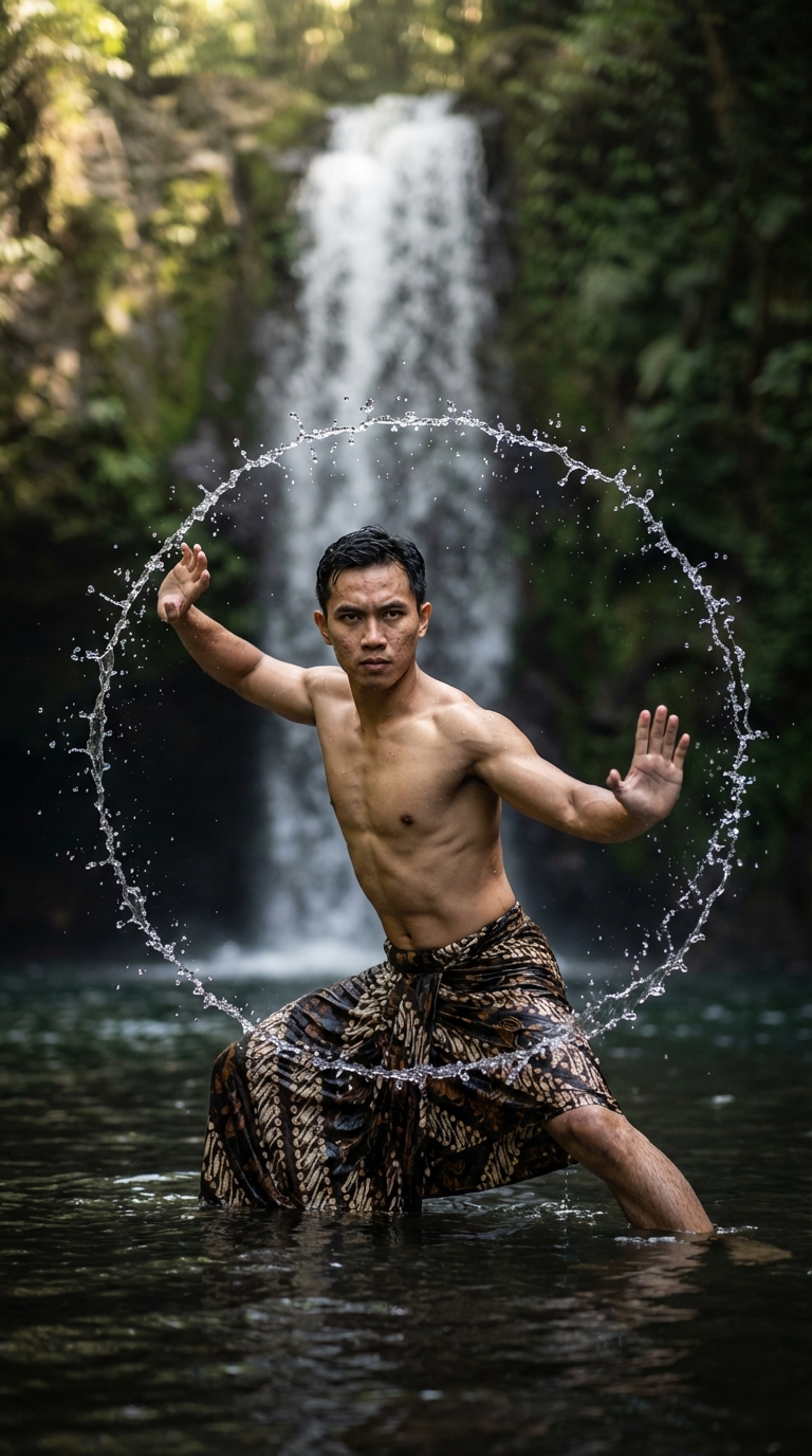 Fitur paling kritis: Sebuah lingkaran air sempurna (perfect circular splash) yang membeku di udara mengelilingi tubuh subjek, seolah-olah dia sedang membentuk perisai air.
