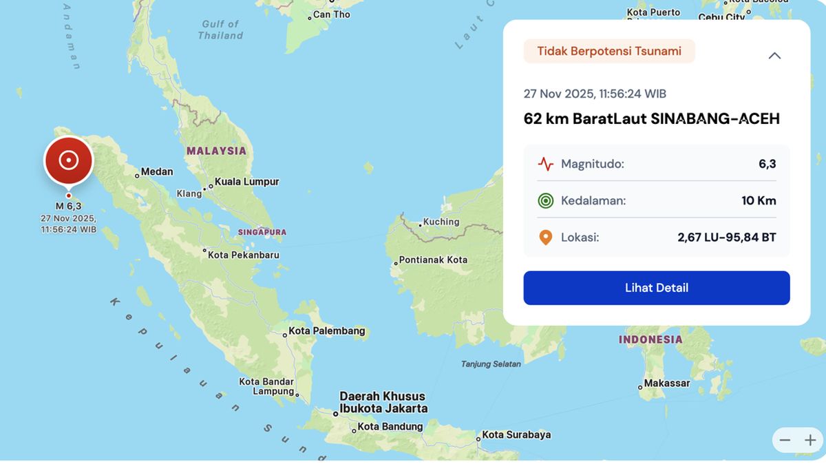 Gempa bumi dengan magnitudo 6,3 terjadi di Sinabang, Aceh, Kamis (27/11/2025) pukul 11.56 WIB. Getaran gempa terasa hingga sejumlah wilayah di Aceh dan Sumatera Utara, termasuk Simeuleu, Banda Aceh, hingga Medan.