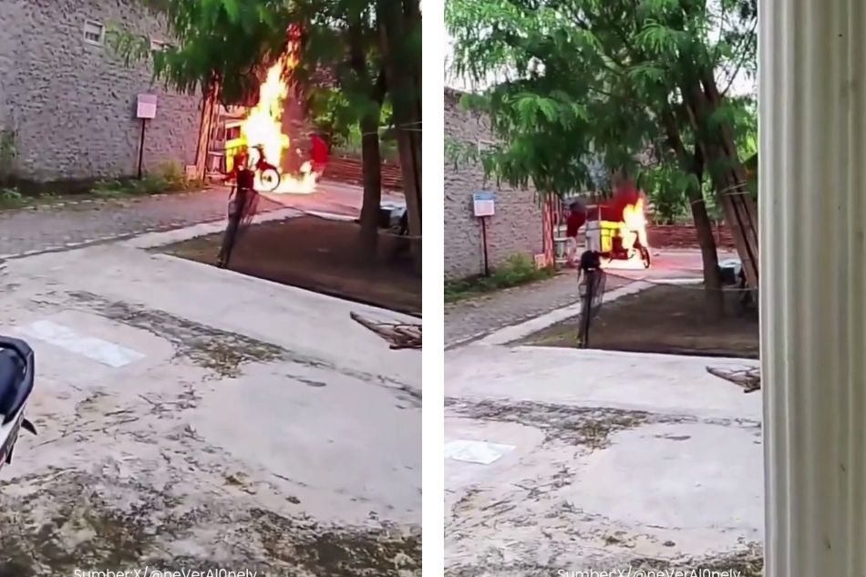 Dalam rekaman video yang beredar, terlihat kobaran api disertai asap hitam pekat menghanguskan seluruh badan gerobak, meski warga sempat berupaya memadamkan api dengan alat seadanya.