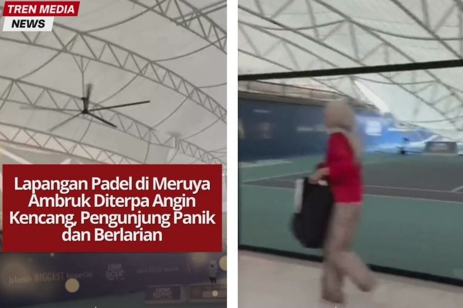 Sebuah lapangan padel di kawasan Meruya, Jakarta Barat, ambruk setelah diterpa angin kencang disertai hujan deras pada Minggu siang (26/10/2025). Kejadian berlangsung cepat dan membuat pengunjung panik berteriak serta berlarian menyelamatkan diri dari lokasi kejadian.