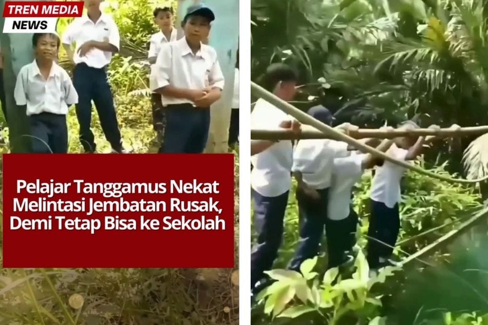 Seorang perekam video di media sosial menyampaikan kegelisahan warganya—video yang ia unggah memperlihatkan pelajar harus melewati jembatan gantung rusak demi sekolah. Jembatan sepanjang 15–20 meter di Desa Tampang Muda, Kecamatan Pematang Sawa, Kabupaten Tanggamus, hanya menyisakan tali sling besi serta rangka kayu lapuk. Tanpa papan pijakan, para siswa berjalan hati-hati sambil berpegangan, menapaki struktur rapuh di atas sungai deras.