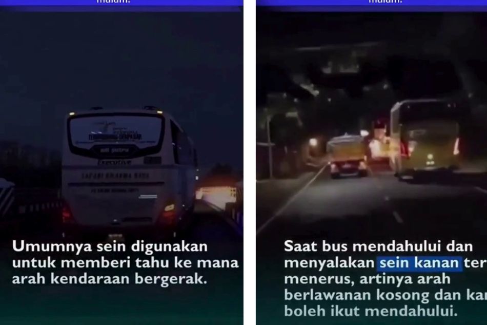 Sebuah peringatan penting ditujukan kepada pengendara agar tidak sembarangan membuntuti bus malam tanpa memahami arti isyarat lampu sein yang digunakan.