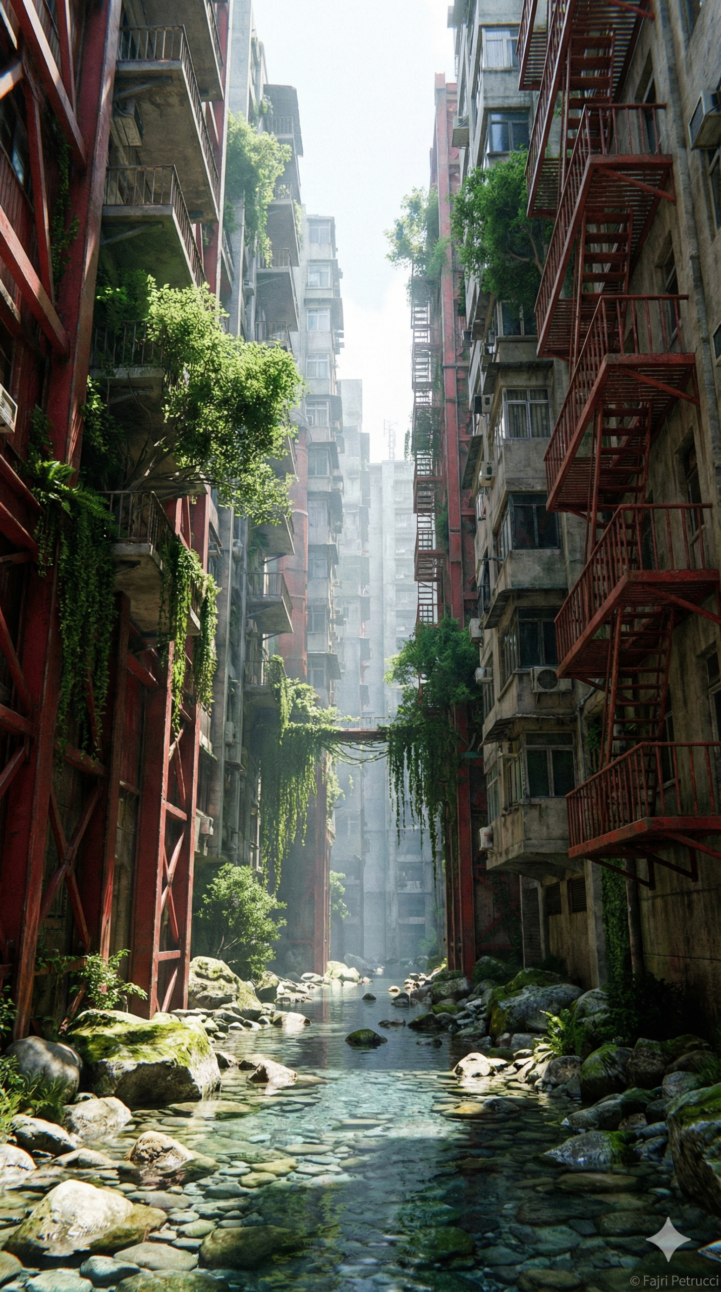 “After the City Learned to Breathe” is a contemplative digital art collection that visualizes the “Great Return” of nature. Inspired by the concept of Nature Reclaims, this series imagines a future where cities are no longer scars on the earth, but gardens where life flourishes among the ruins of the old world.