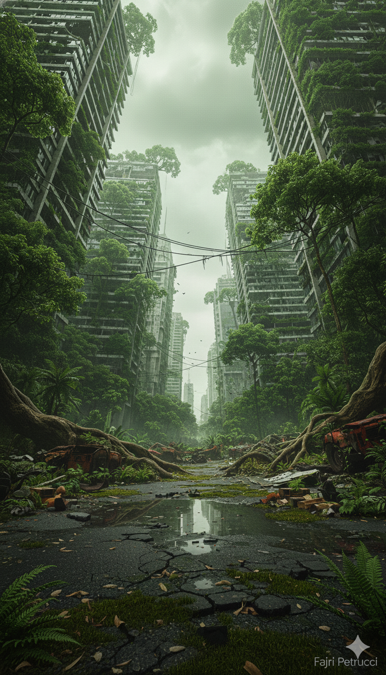 Abandoned [Skyscraper/City Street] reclaimed by dense tropical forest, vines and flowers growing over ruins, cinematic natural lighting, soft mist, clear water streams, Solarpunk aesthetic, hyper-realistic vegetation, 8k resolution, rendered with Gemini Nano Banana –ar 16:9