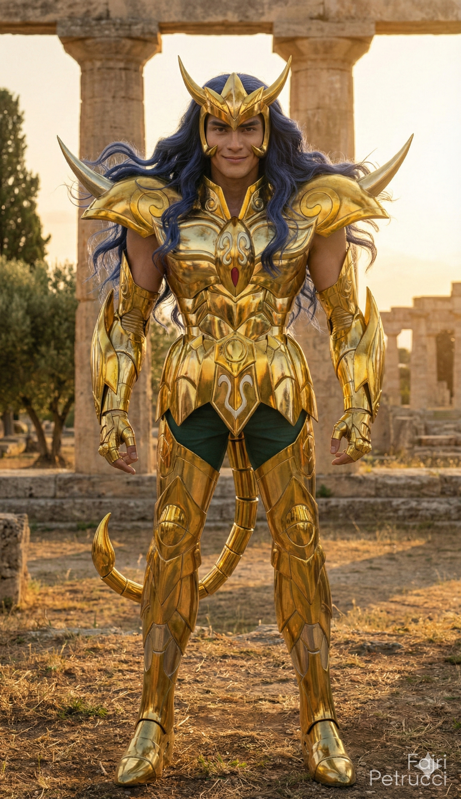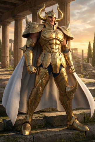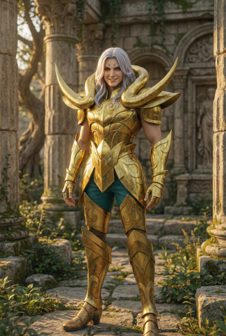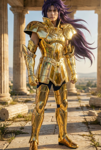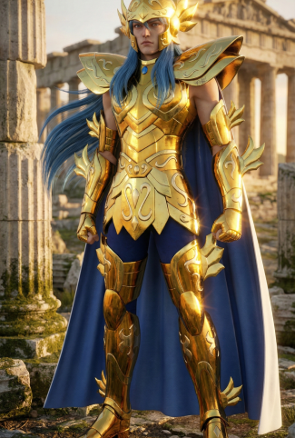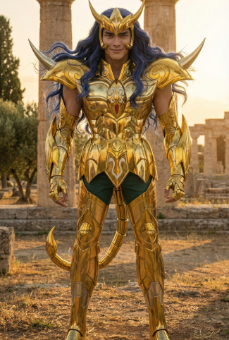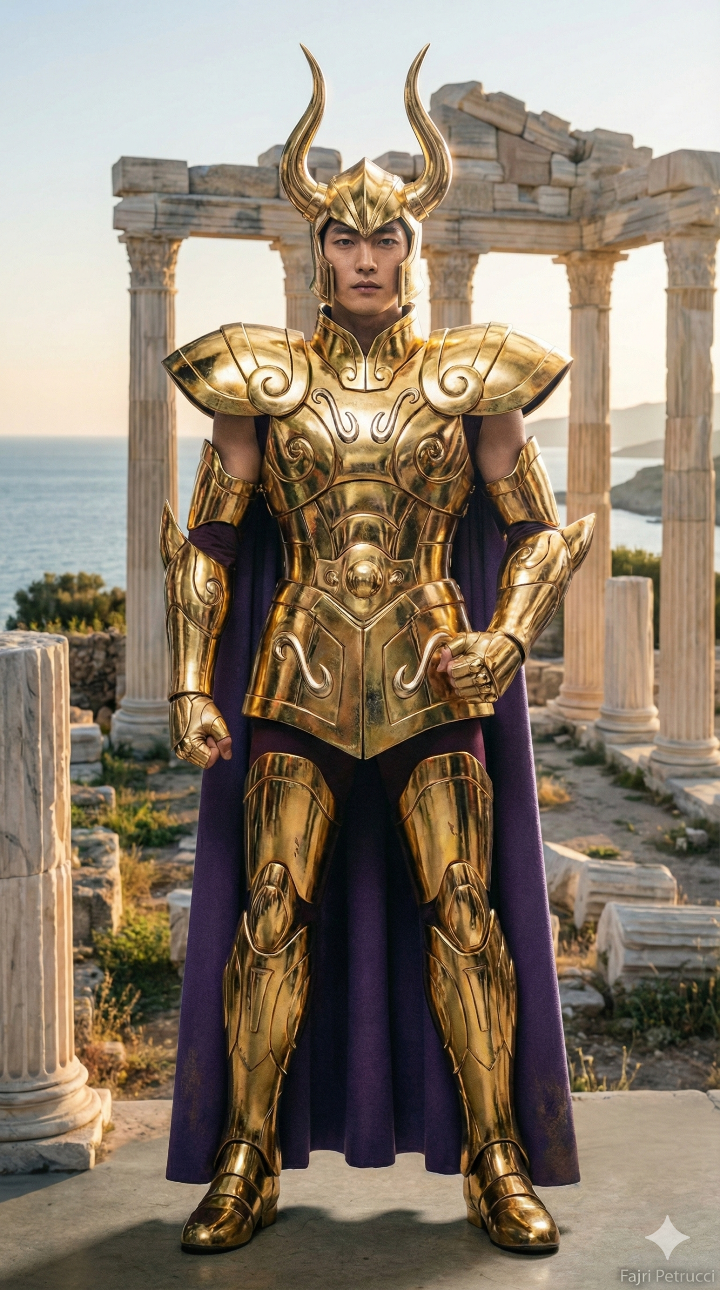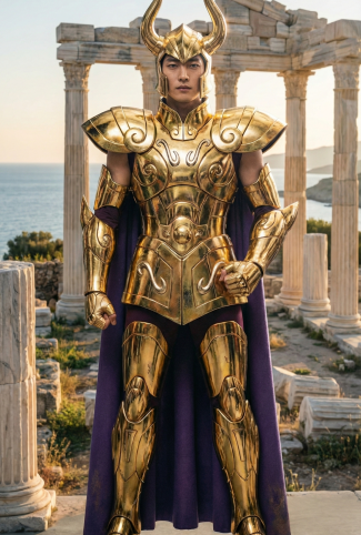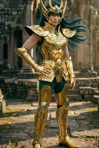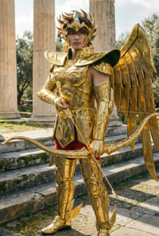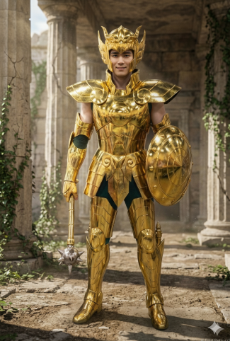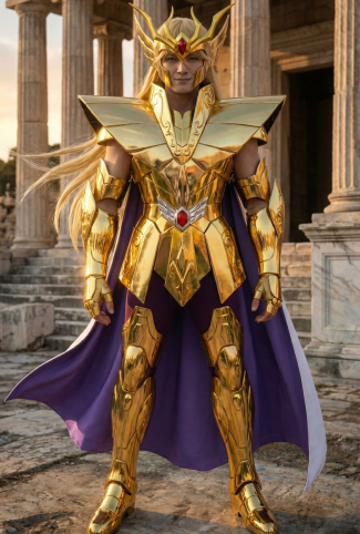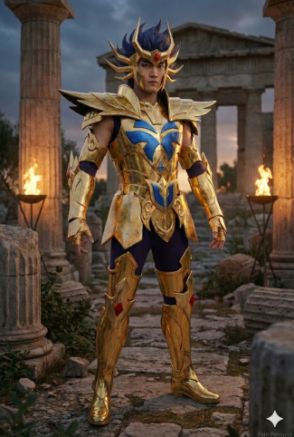 Karakter Gold Saint dari film Saint Seiya ditampilkan dalam versi real life dengan visual yang menyerupai adegan live-action. Balutan armor emas khas para Gold Saint tampil detail dan megah, dipadukan dengan latar bangunan klasik yang mengingatkan pada kuil-kuil kuno di Sanctuary, tempat para ksatria emas menjaga jalur menuju Athena.
