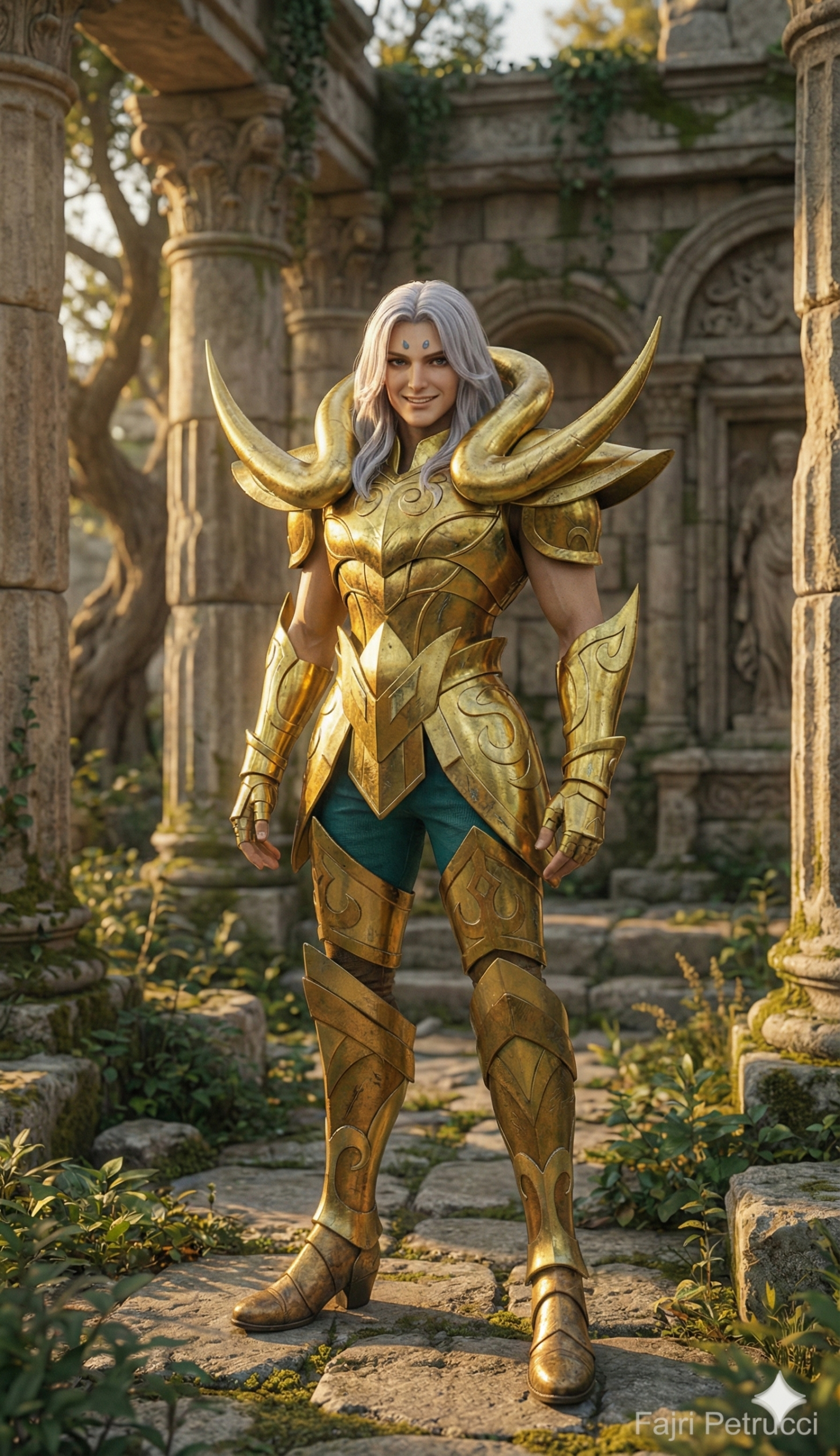 Visual pada gambar ini menghadirkan nuansa yang selaras dengan latar film Saint Seiya, di mana arsitektur batu klasik, pencahayaan alami, dan pose karakter dirancang seolah menjadi bagian dari proses syuting film fantasi epik. Karakter tidak hanya tampil sebagai pahlawan, tetapi juga sebagai penjaga warisan kuno dengan aura serius dan penuh wibawa.