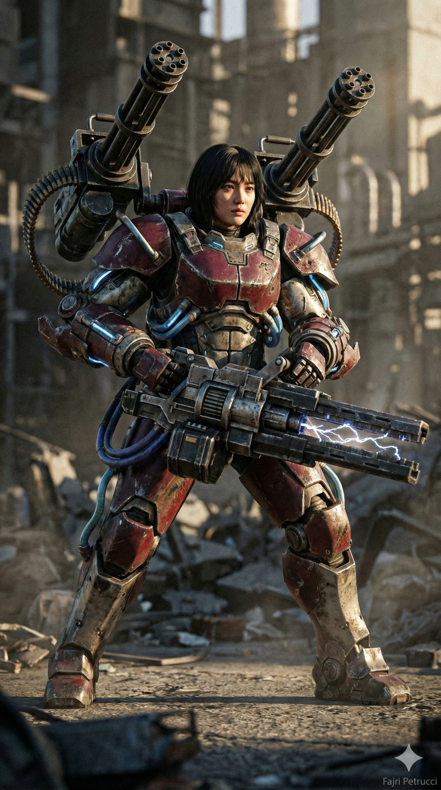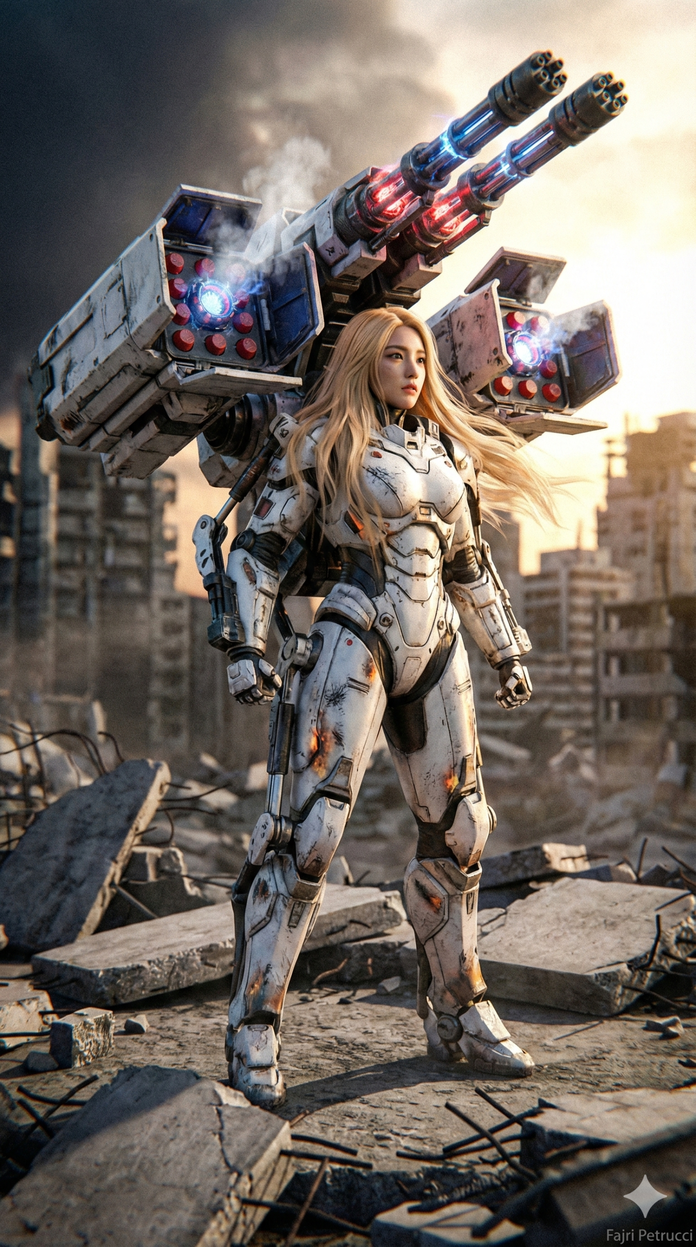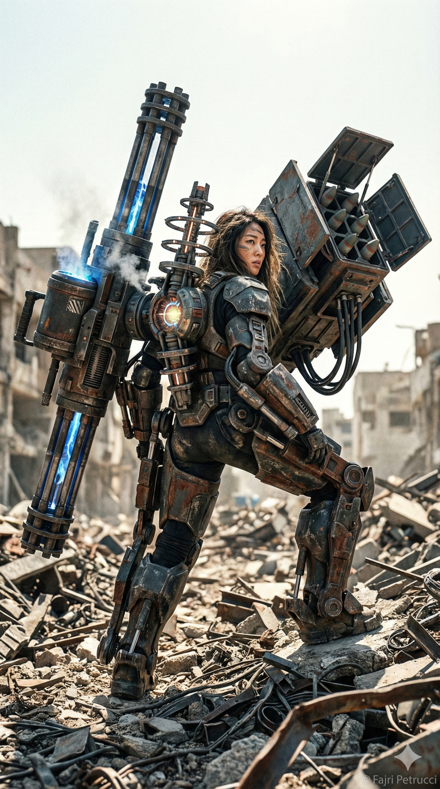 Full body shot of a female soldier wearing heavy [Mecha Exoskeleton/Power Armor], equipped with massive [Shoulder Cannons/Gatling Guns], standing in a [Destroyed City/Rubble], post-apocalyptic war zone, dust and smoke atmosphere, battle-worn metal texture, dramatic sunlight, 8k resolution, rendered with Gemini Nano Banana –ar 9:16
