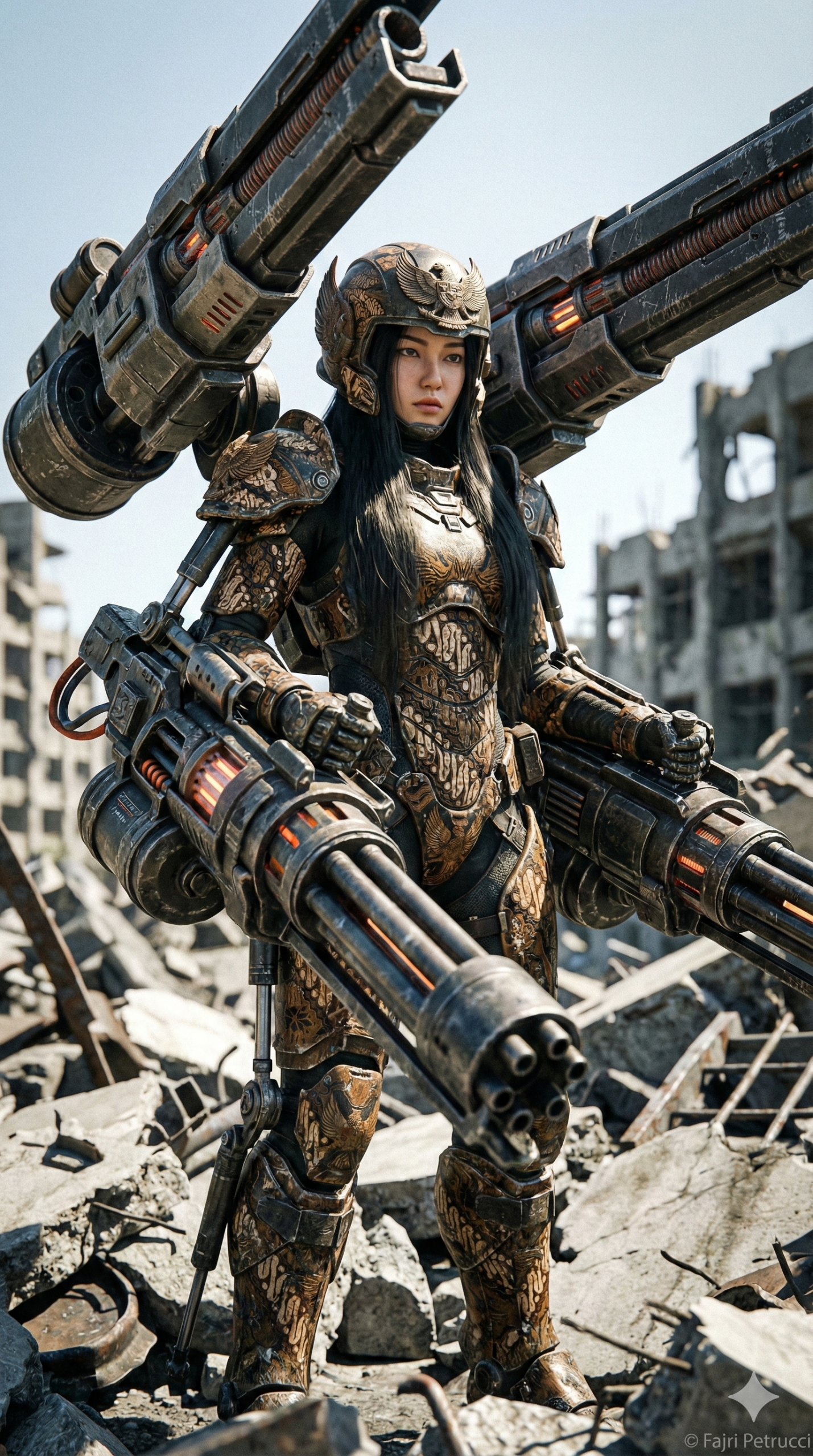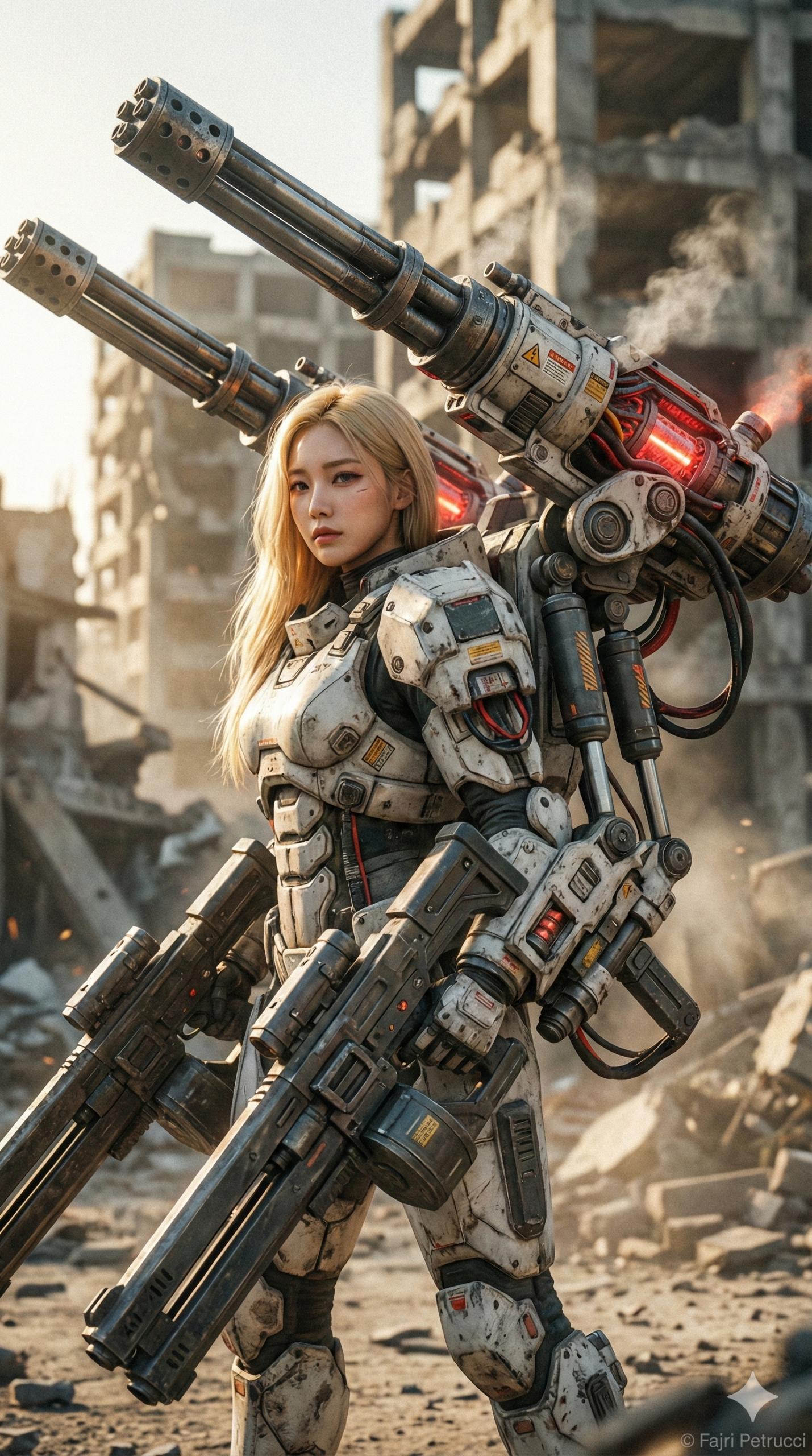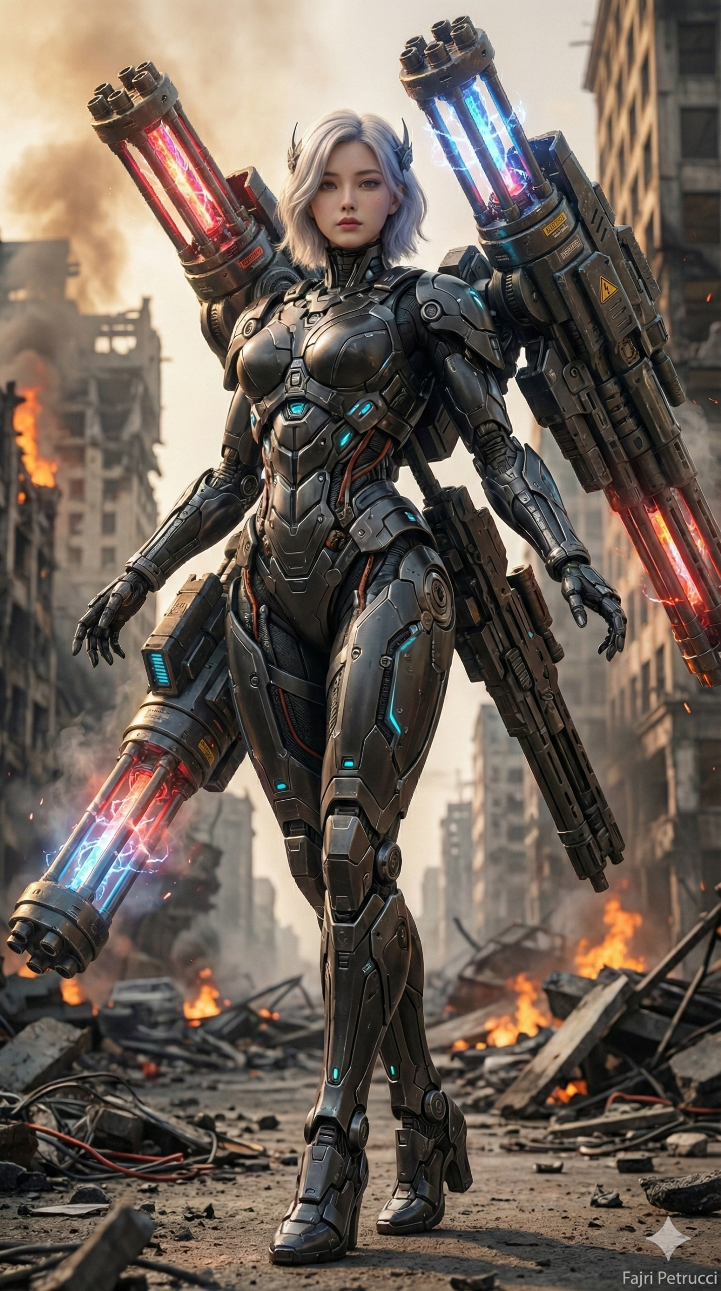 Full body shot of a female soldier wearing heavy [Mecha Exoskeleton/Power Armor], equipped with massive [Shoulder Cannons/Gatling Guns], standing in a [Destroyed City/Rubble], post-apocalyptic war zone, dust and smoke atmosphere, battle-worn metal texture, dramatic sunlight, 8k resolution, rendered with Gemini Nano Banana –ar 9:16