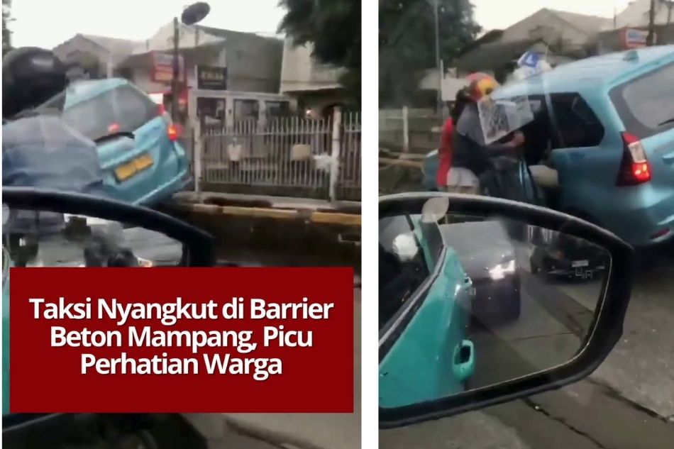 Sebuah taksi dilaporkan nyangkut di barrier beton pembatas jalan di kawasan Mampang, Jakarta Selatan, pada Jumat sore (27/3). Kejadian tersebut sempat menarik perhatian warga dan pengguna jalan yang melintas.