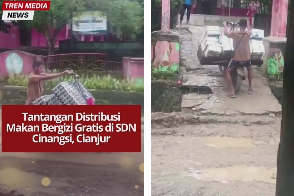 Program Makan Bergizi Gratis (MBG) di SDN Cinangsi, Naringgul, Cianjur membawa manfaat besar bagi siswa, namun distribusinya menghadapi kendala serius. Jalan rusak parah di depan sekolah membuat mobil box sulit melintas, sehingga petugas terpaksa menggunakan sepeda motor yang berisiko tinggi, terutama saat membawa nampan makanan bertumpuk.