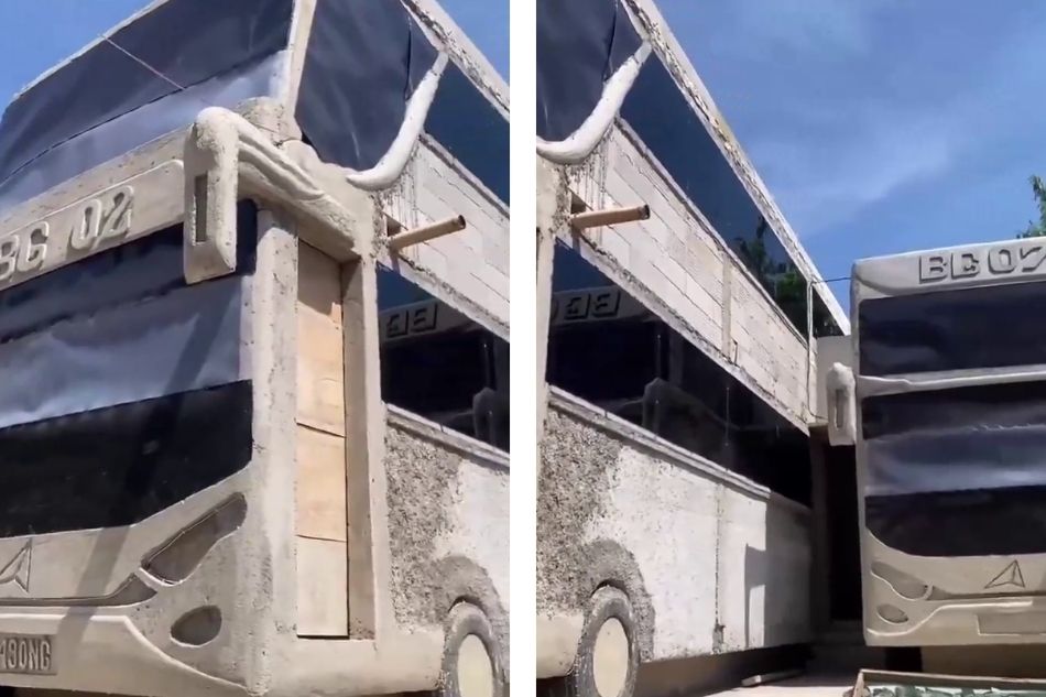 Dalam video yang beredar, tampak struktur bangunan dibuat menyerupai bentuk bus lengkap dengan detail khasnya, sehingga sekilas terlihat seperti dua kendaraan besar yang sedang berhenti.