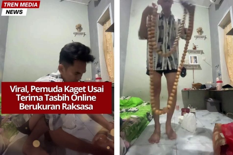Sebuah video viral di media sosial memperlihatkan seorang pemuda yang terkejut saat menerima pesanan tasbih dari toko online. Dalam rekaman itu, terlihat ia membuka paket dengan penuh rasa penasaran, lalu kaget sekaligus tertawa terbahak-bahak ketika mendapati tasbih yang datang ternyata berukuran sangat besar. Mengenakan pakaian santai di dalam kamar, pemuda tersebut menunjukkan tasbih raksasa itu sambil bereaksi heboh.